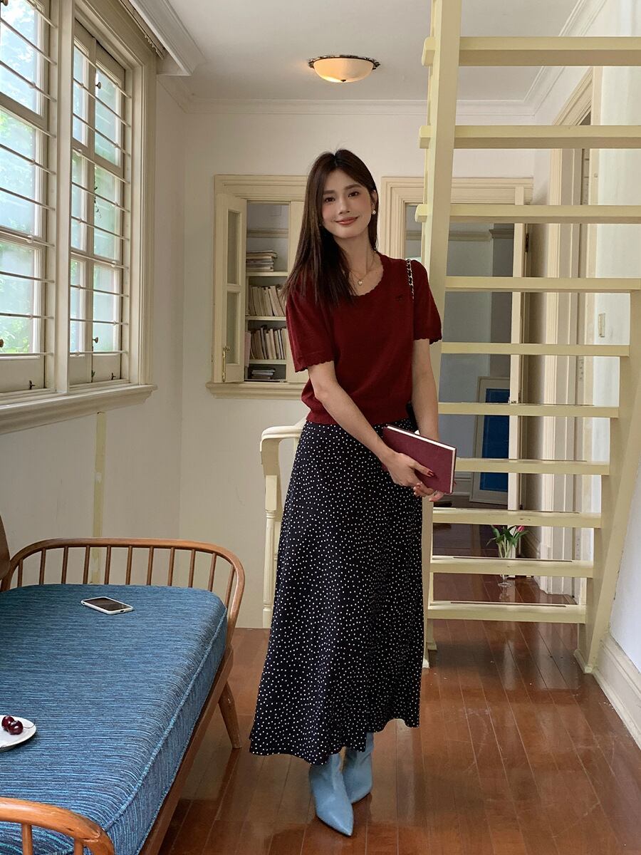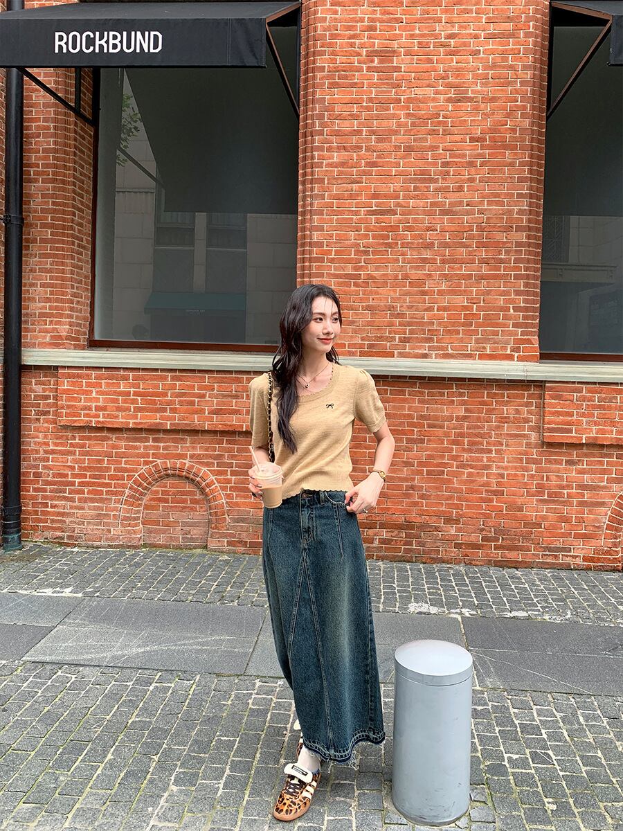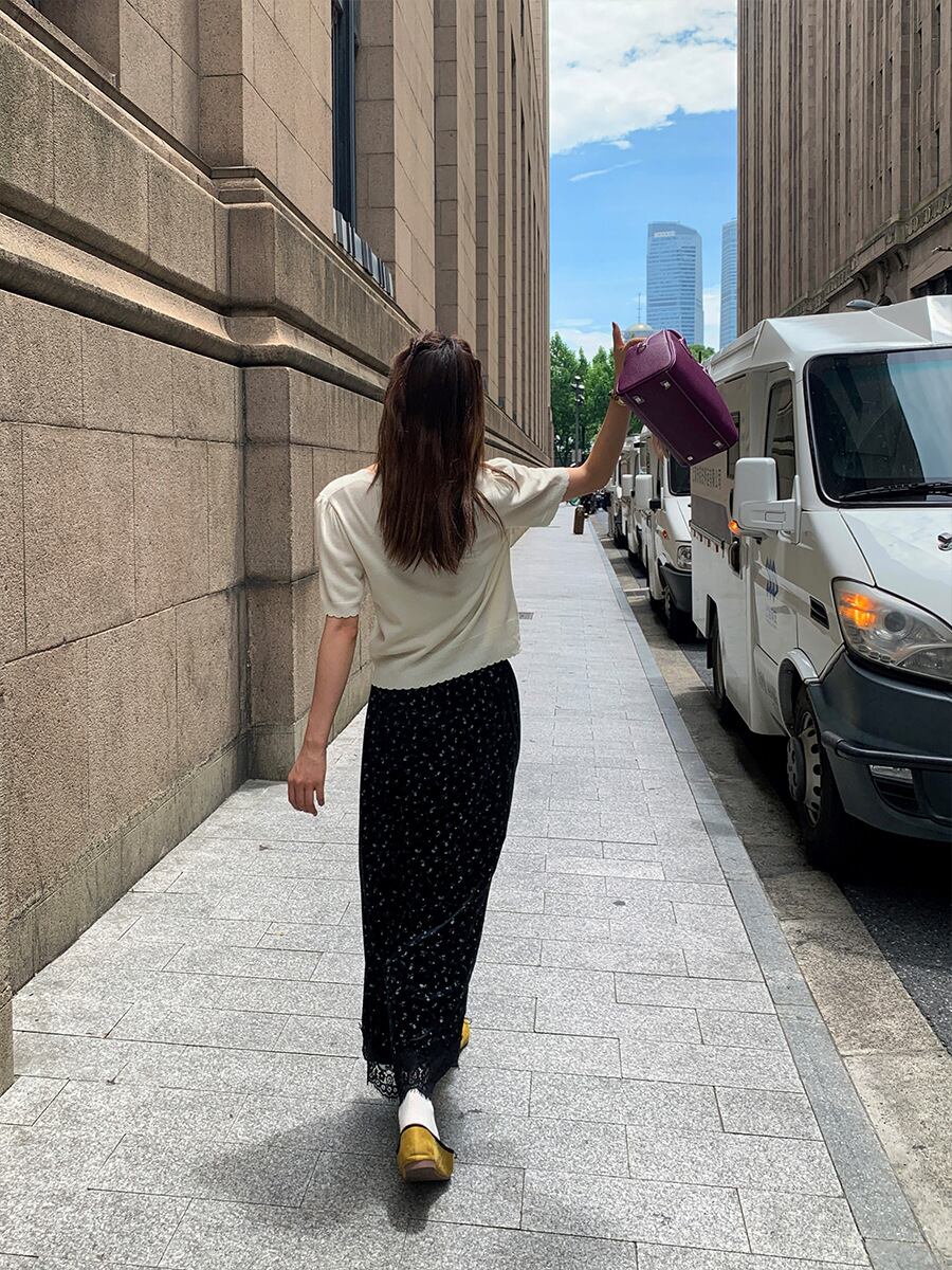 休日は、デニムやスカートと合わせてカジュアルダウン。