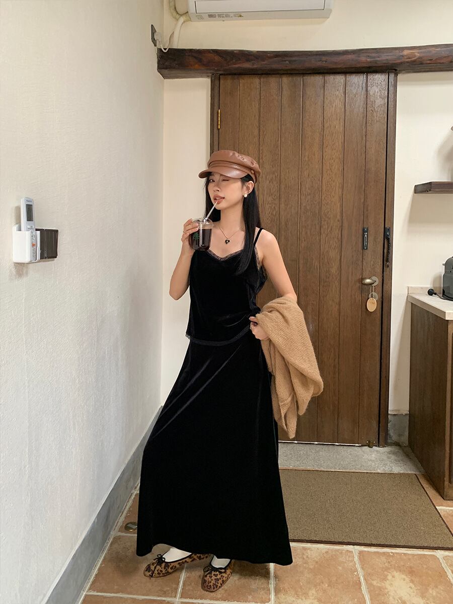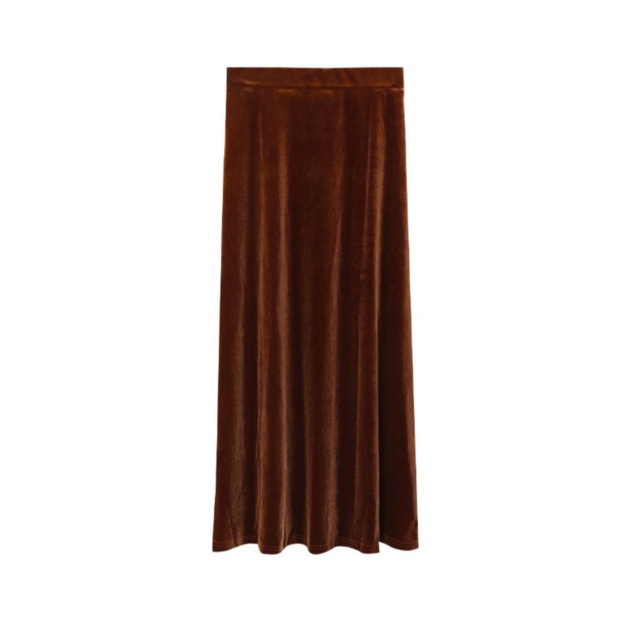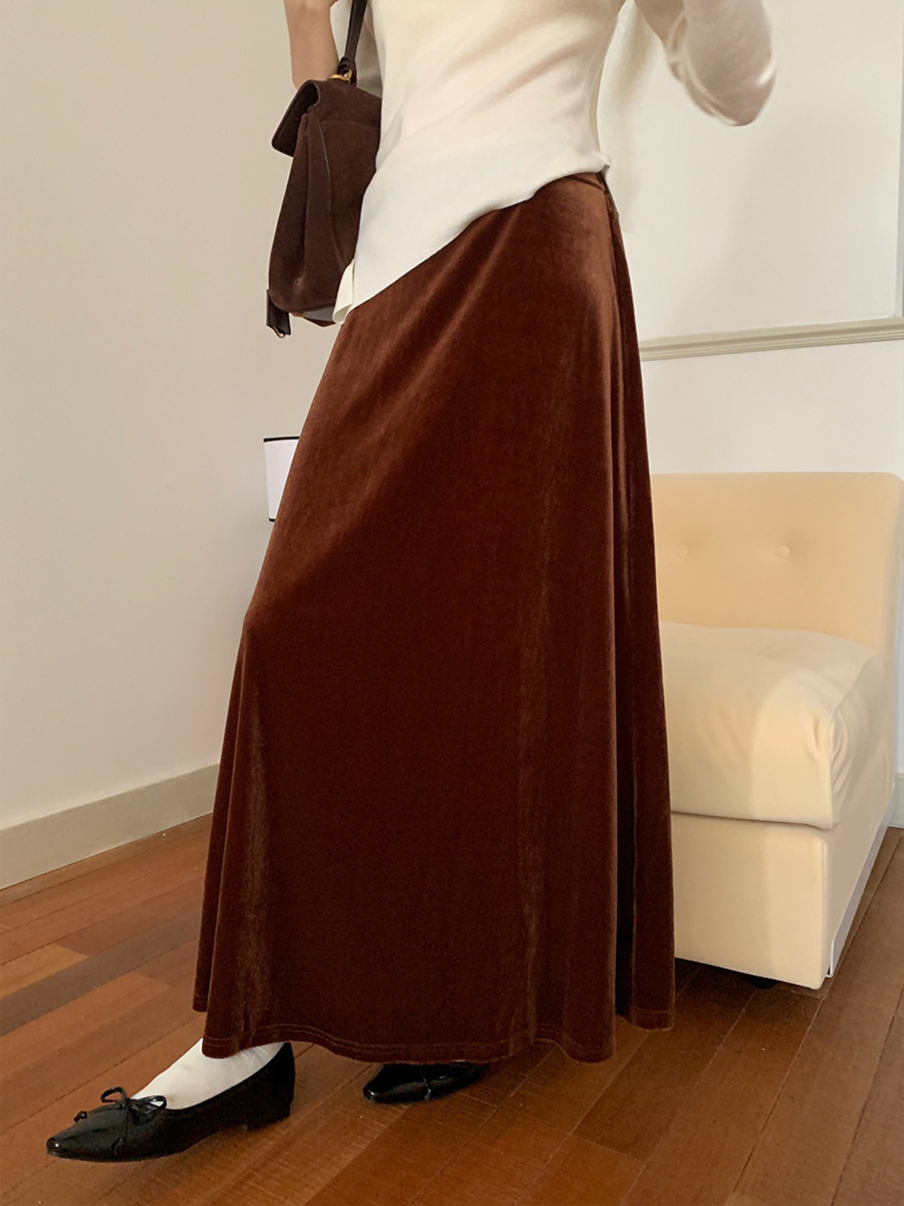 上質なベルベット素材が、大人の女性らしさを引き立てるロングスカート