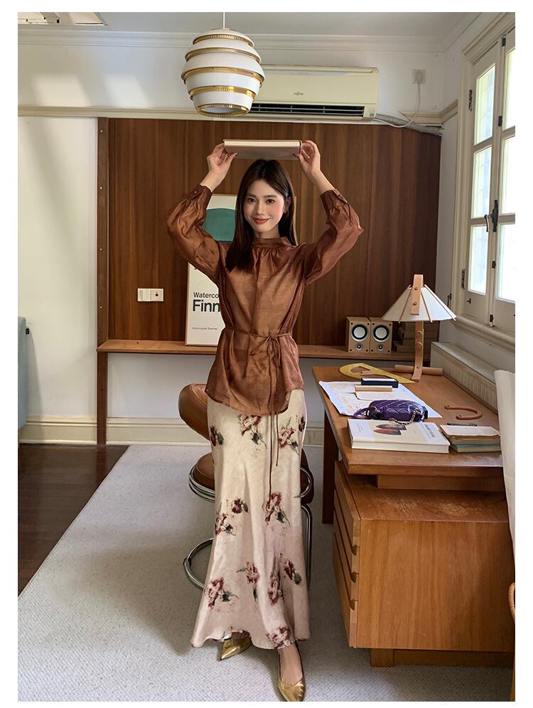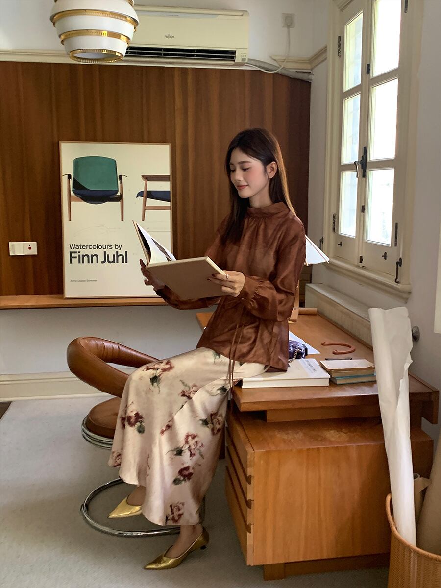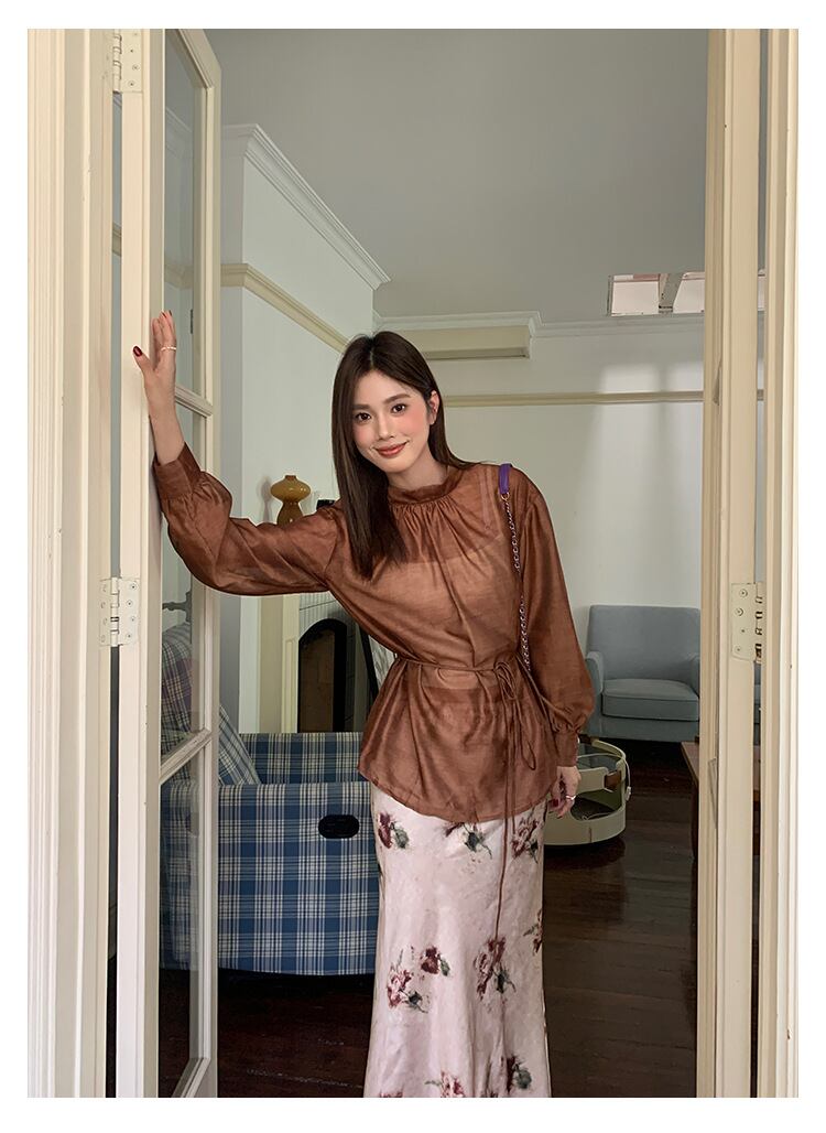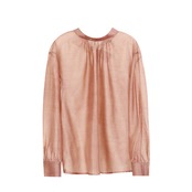 首元はすっきりとしたハーフハイネック、袖口はギャザーでふんわりとしたシルエット。