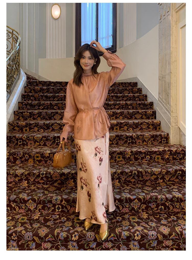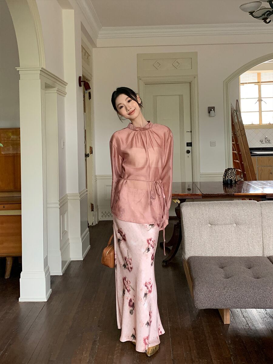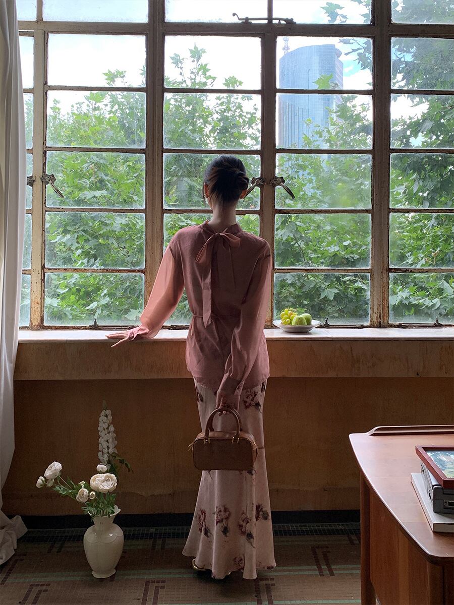 オフィスシーンにも馴染む上品なブラウスでありながら、後ろ姿はリボンで結ぶバックシャンデザイン。
