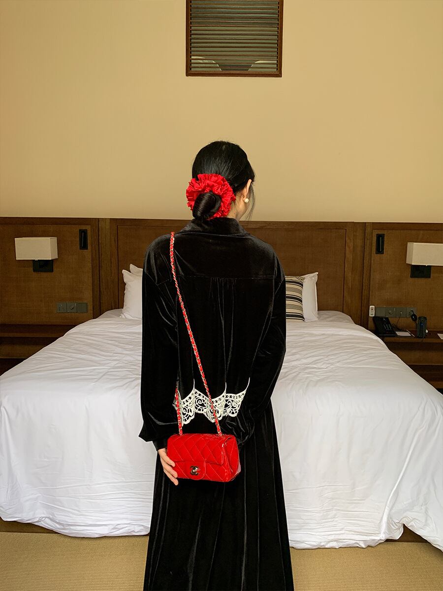 滑らかで光沢のあるベルベット素材が、上品で高級感のある印象を与えます。