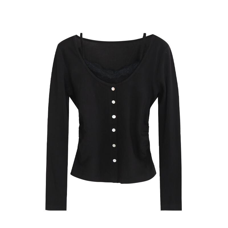 フェイクレイヤードデザインが目を惹く、レースとニットを組み合わせたトップス。