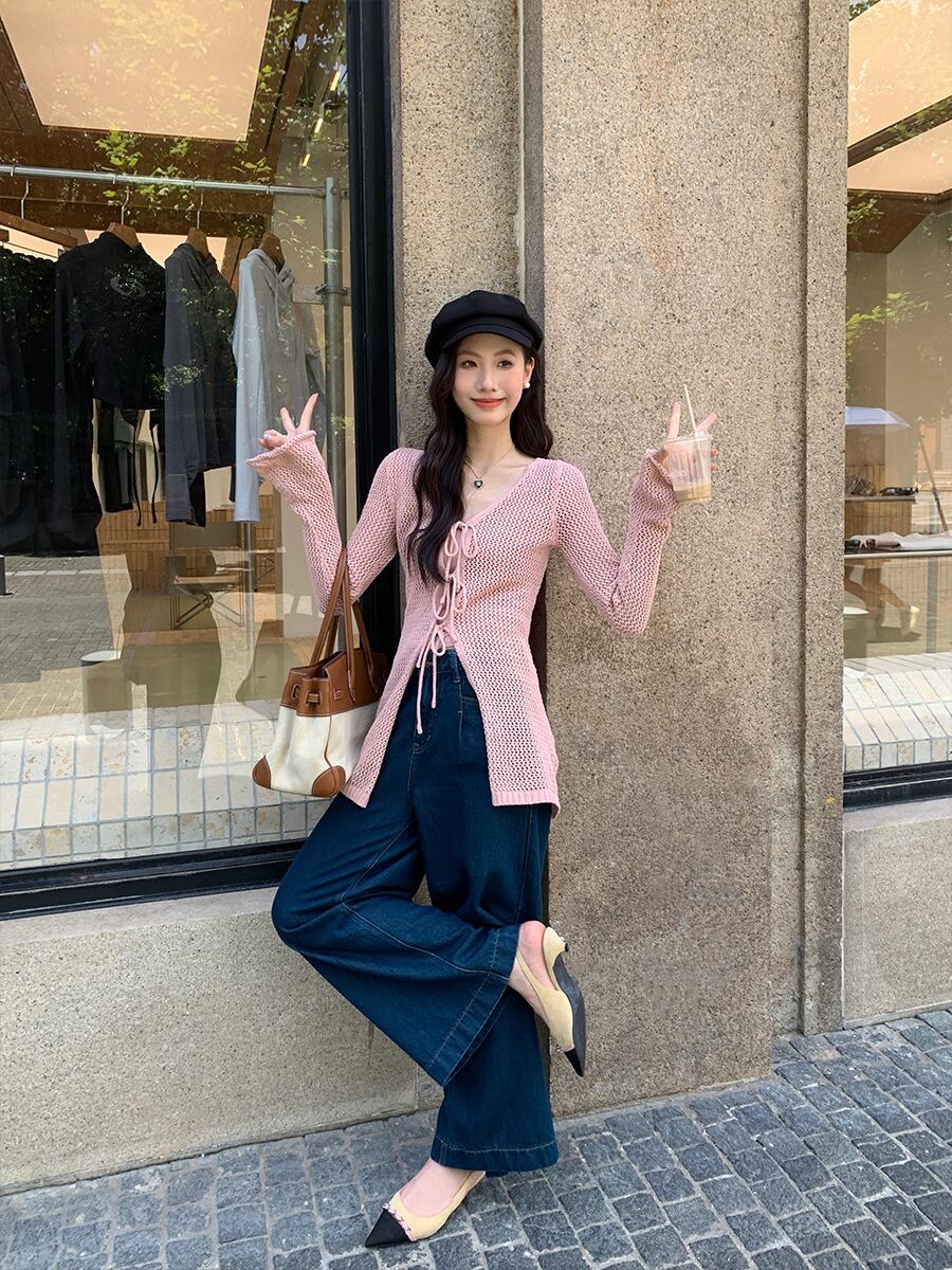 Vネックと透かし編みが女性らしい、着回し自在なニットカーディガン。