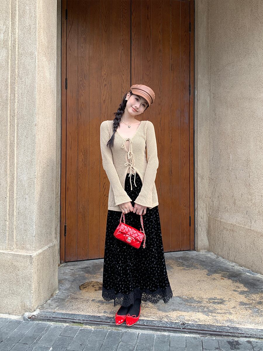 フロントのリボンを結んで、シルエットに変化を付けることもできます。