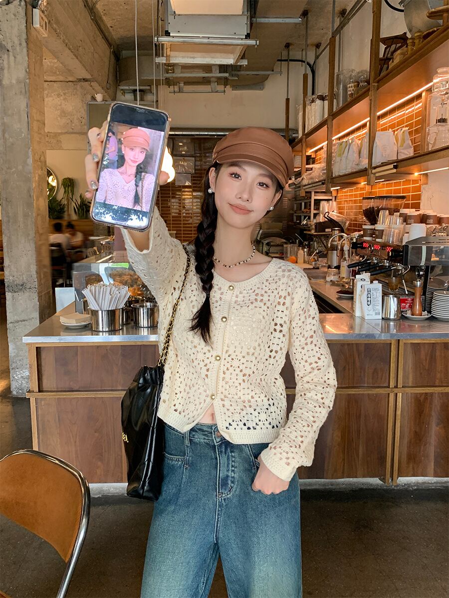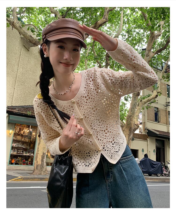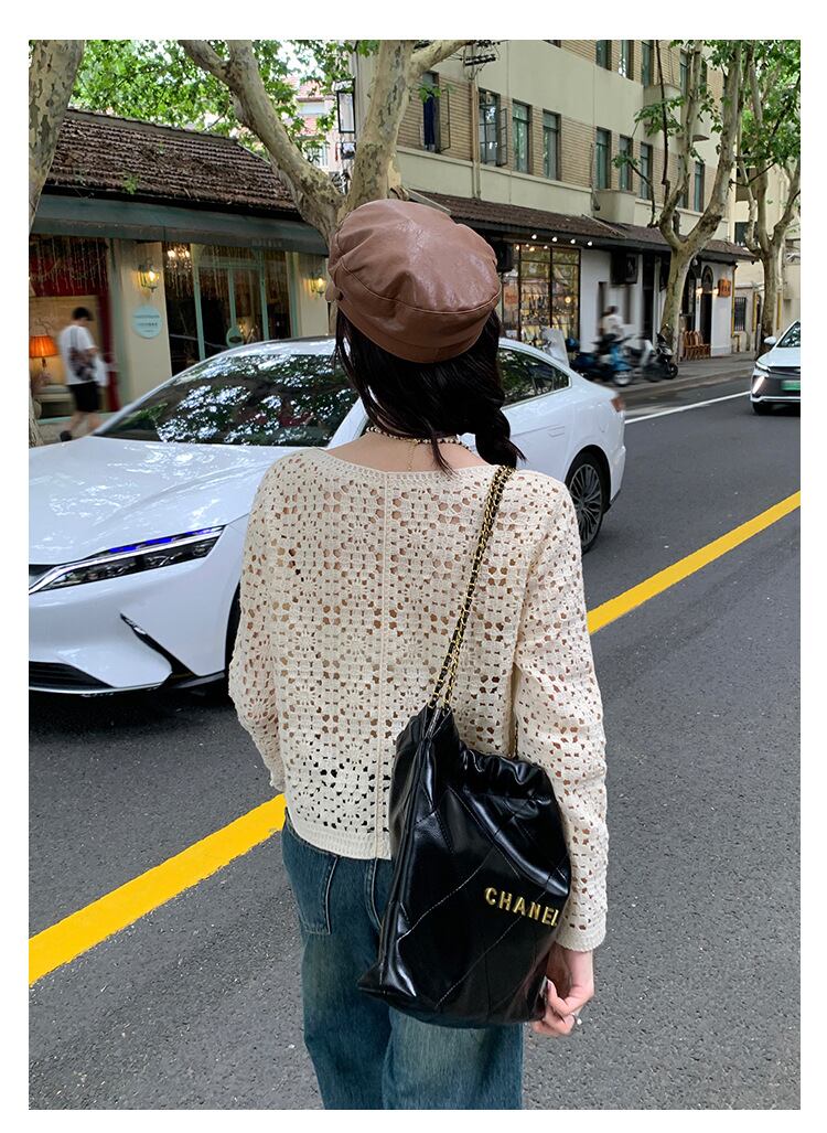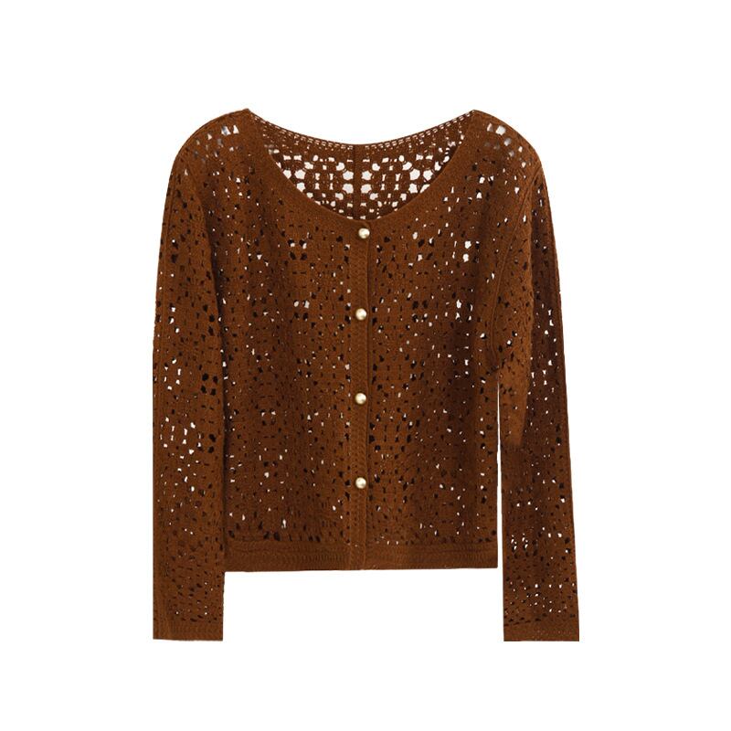 繊細なクローシェ編みと透かし編みが、上品で女性らしい印象を与えてくれます。