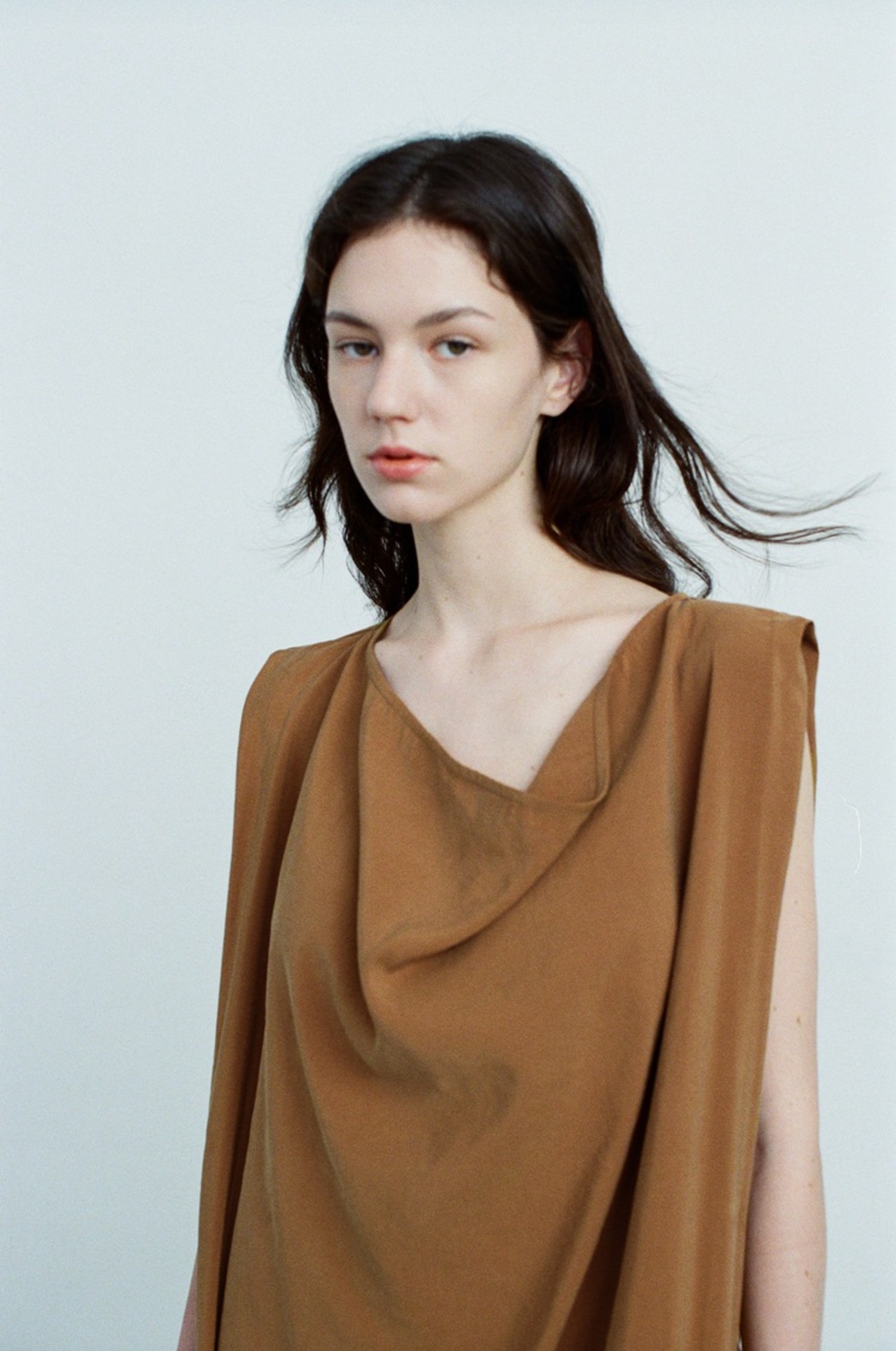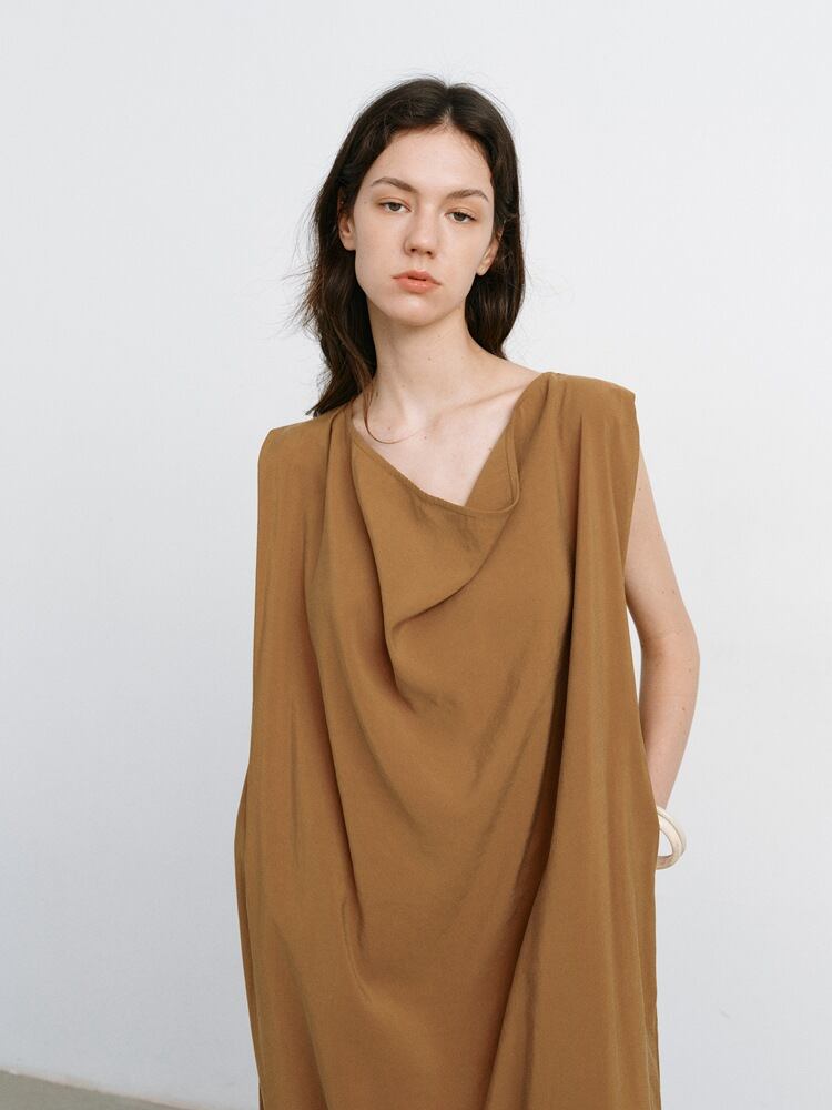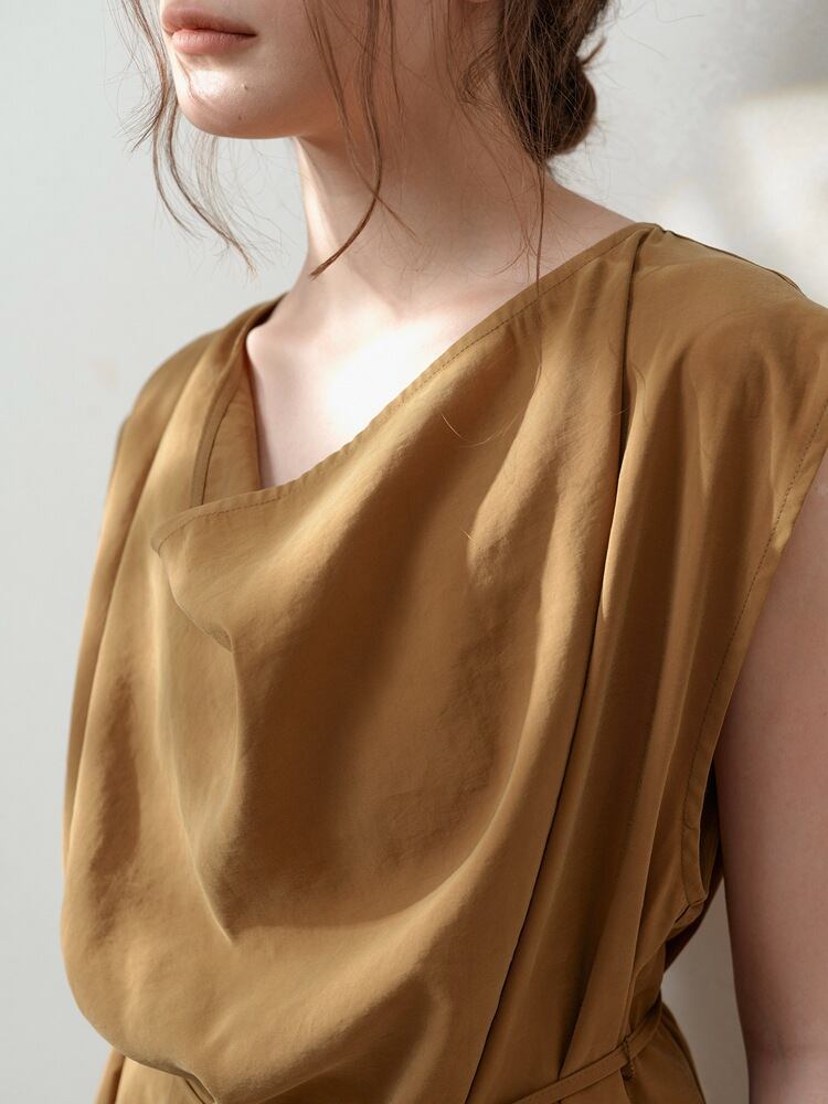 広めに開いたスクープネックが、デコルテラインを美しく演出し、女性らしさを引き立てます。